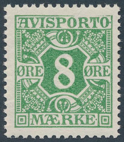 1914. 8 øre, grøn. Vm.kors. Variant: HØJRE HALVDEL AT ØVRE RAMMELINIE MANGLER: Postfrisk. Sjælden.