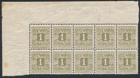 1907. 1 øre, oliven. Postfrisk øvre marginal 10-BLOK med variant i pos.4: PLET PÅ A. Smuk enhed.