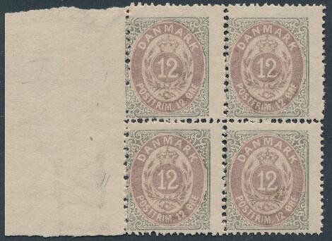 1875. 12 øre, grå/violet. Tk.14. Postfrisk 4-BLOK med venstre MARGINAL. AFA: 9600+