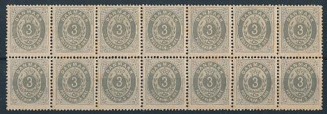 1875. 3 øre, ultramarin/grå. Postfrisk 14-BLOK incl. OVALFEJL. Nogle med en anelse brunlig gummi. AFA: 56000+