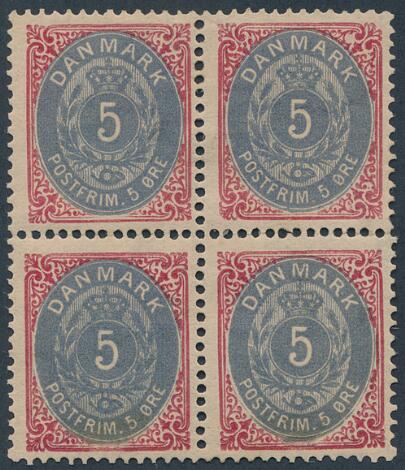 1875. 5 øre, 4.tryk, pos. 82-83/92-93. Pos. 83 med STOR PERLEFEJL. Smuk ubrugt fireblok. Attest Nielsen