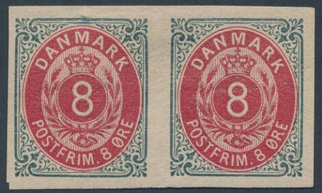 1875. 8 øre, 70.tryk. UTAKKET parstykke. Venstre mærke med lille tyndhed