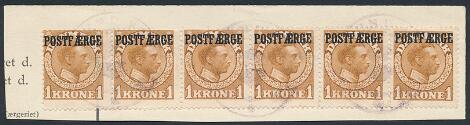 1919. Chr. X. 1 kr. yellowbrown. Fine lightly used stripe of 6 on small papercut from parcelcard. AFA 9000+