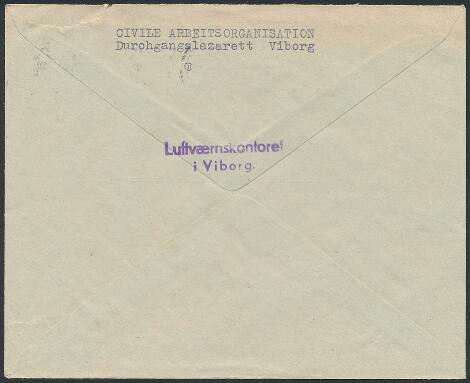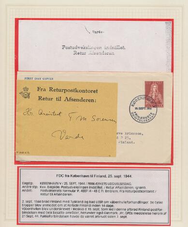 1944. FDC from København 25.9.44 to Finland. Canc. "Postudvekslingen indstillet / Retur Afsenderen" in GREEN COLOUR (only known on FDC's). Ex. Menne Larsen