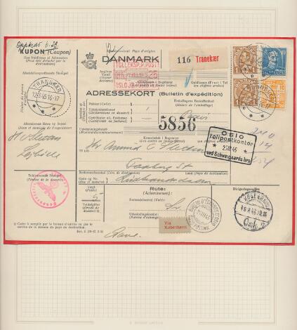 1945. Parcel-card from Tranekjær, via København to Norway. Censored in SØNDERBORG. SUPERB condition. Ex. Menne Larsen
