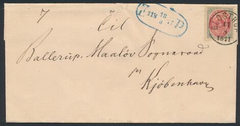 1871. FODPOSTBREV, med 4 sk. grå/rød, sendt fra GLOSTRUP 17.8.1871, til København, og udbragt med Fodposten "18.8.1871". Smukt brev, mærket med enkelt manglende