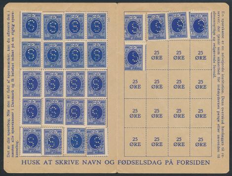 Sparemærker. Sparemærkebog med 25 isatte mærker, alle mærker med perfin "S"