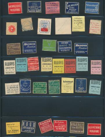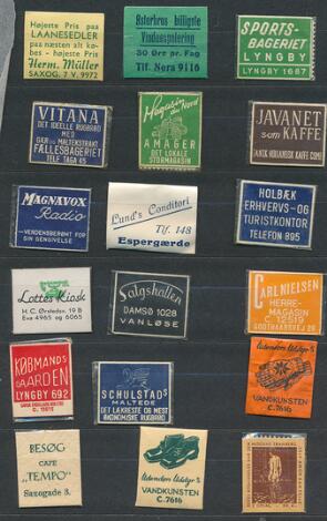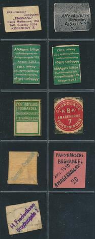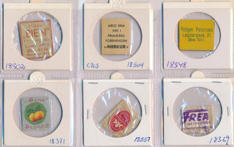 FRIMÆRKEPENGE. Planche med 6 bedre frimærkepenge, bl.a. Frea, "Dana" og Kiosken BIEN. Nummereret efter Sømod katalog