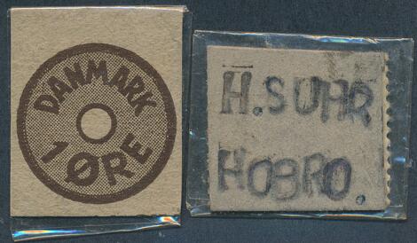 FRIMÆRKEPENGE. 2 stk. Mønt 1 øre uden frimærke og H. SUHR, HOBRO (optegnet med blyant). Ex. Jørgen Sømod.