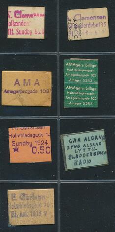 FRIMÆRKEPENGE. 8 sjældne frimærkepenge + 1 fotokopi, alle fra Amager. Ex. Jørgen Sømod.