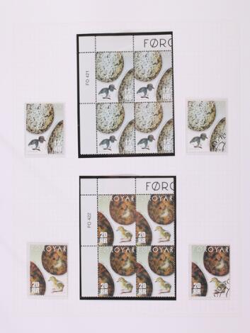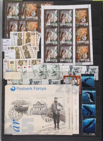 Færøerne. 1990-2002. Kasse med 4 ringbind fyldt med materiale fra abonnement. Enkeltmærker i stemplet og postfrisk, marginal 4-blok, FDC enkelt og 4-blok
