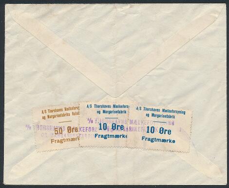 FRAGTMÆRKER. Ca. 1930. A/S Thorshavns Mælkeforsyning, 2 stk. 10 øre, mørkblå samt 50 øre, brun på fragtbrev. Meget sjældent