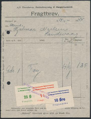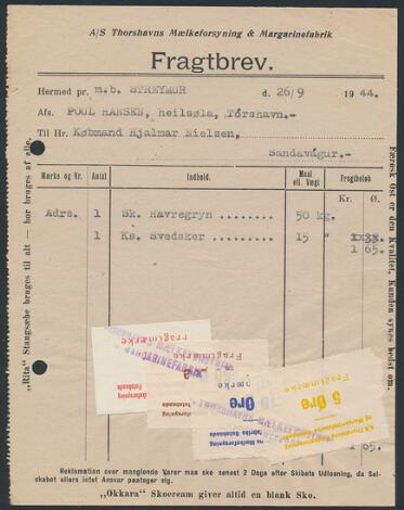 FRAGTMÆRKER. 1944. A/S Thorshavns Mælkeforsyning, 5 øre, gul, 10 øre, blå, 50 øre, brun og 1 kr. rød på fragtbrev. Meget sjældent