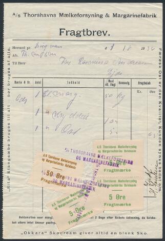 FRAGTMÆRKER. 1934. A/S Thorshavns Mælkeforsyning, 3 stk. 5 øre, lysgrøn samt 50 øre, brun på fragtbrev. Meget sjældent