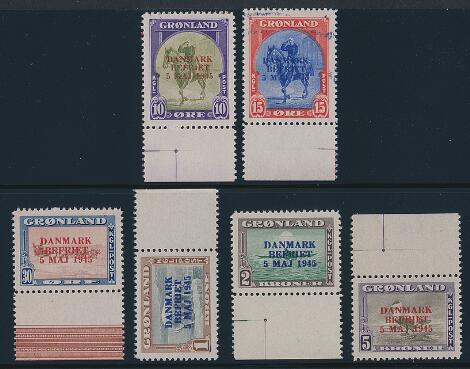 1945. Danmark Befriet, Changed colours. Complete NH set. All values with sheet margin