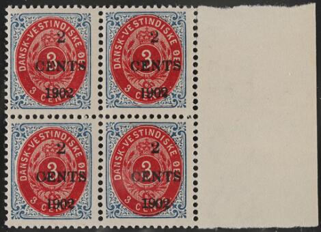 1902. 2/3 cents, blå/rød. Lokalt overtryk. Pos. 39-40/49-50. 4-blok incl. pos. 50 ISOLERET RET RAMME. 3 postfriske mærker incl. den rette ramme. AFA 4520+. Att.