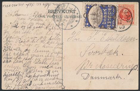 1909. Julemærke. Brugt på kort med 10 Bit, Fr.VIII, rød, sendt til Danmark. Stemplet ST. THOMAS 6.12.1909.