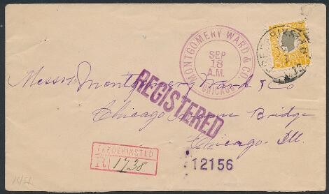 1905. Chr.IX. 50 Bit, gul/grå. Single frankering på anbefalet brev til USA, stemplet FREDERIKSTED 16.9.1912.