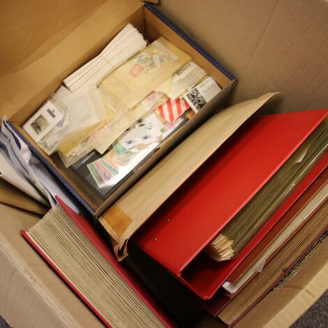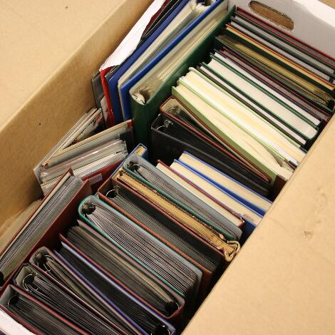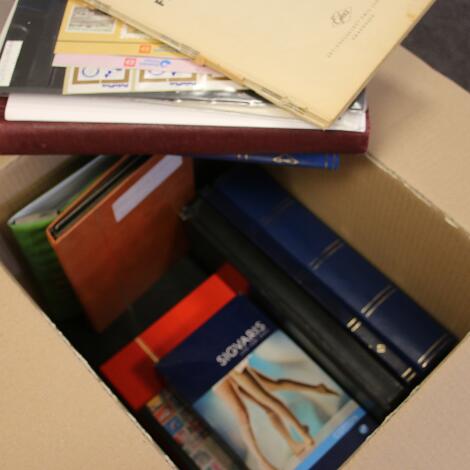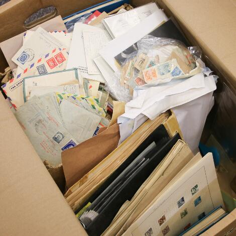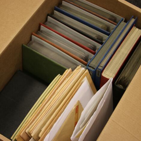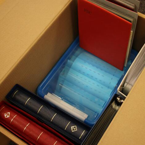 Hele Verden. Stor flyttekasse fyldt med albums, samlinger, lagerpartier, breve og FDC samt lidt årsmapper