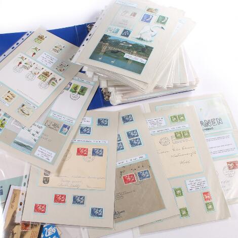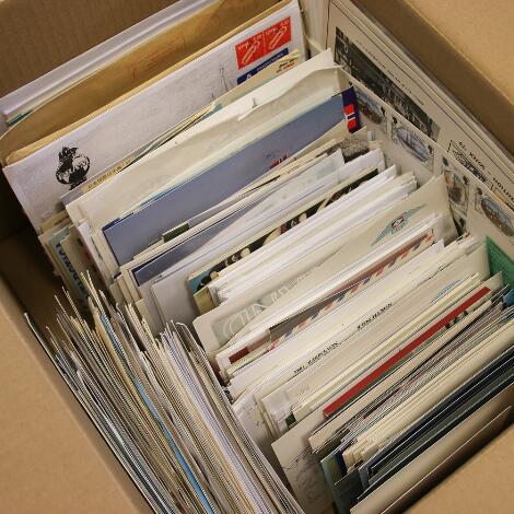 Realisation. Parti i 2 flyttekasser med bl.a. ældre nyhedsabbonement, samling danske FDC i flere albums, helark, juleark, indstiksbøger m.m.