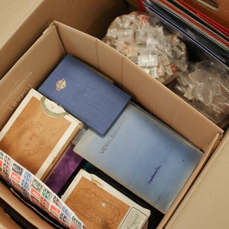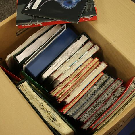 Hele Verden. Parti i 2 store flyttekasser med mange samlinger, album, lagerbøger, Postfærge, mærkater, postkort og meget andet.
