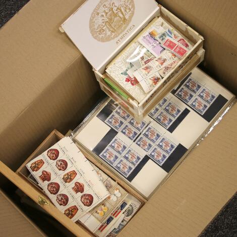 Hele Verden. Stor flyttekasse fyldt med bl.a. stort antal danske bundter, postfrisk materiale incl. miniark m.m.