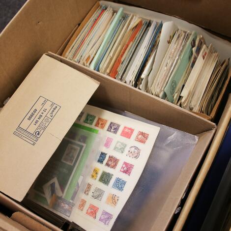 Realisation. Stort originalt parti i store kasser fyldt med alverdens album, breve (bl.a. er set brev med 4 RBS), FDC, julemærker, æsker, nogle ældre auktionslo