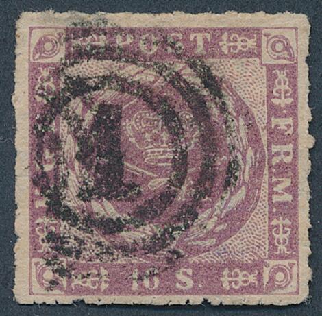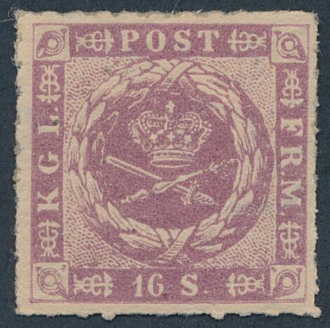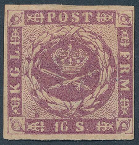 1863. 16 skilling, dyb rødlig lilla, utakket. Plade I, nr. 27 med variant "STOR BULE PÅ RAMME I SØ-POSTHORNFELT"