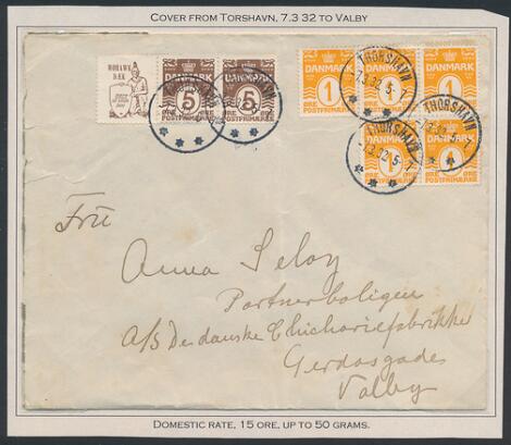 1928. Mohawk Dæk, 5 øre, brown. Strip of 3 on commercial cover from THORSHAVN (Faroes) 7.3.32 to Valby. Very rare. AFA 9.000+