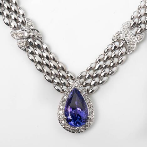 Tanzanit- og diamanthalskæde af 14 kt. hvidguld prydet med dråbeformet tanzanit på ca. 8.00 ct. og talrige diamanter på i alt ca. 2.50 ct. G-H/VS-SI. Ca.