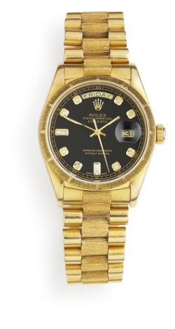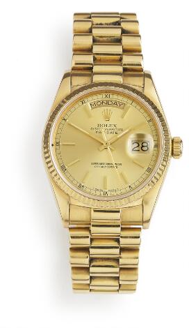 Rolex: A gentleman's wristwatch of 18k gold. Model Day-Date, ref. 18078. Chronometer certified automatic movement with day and date. Ca. 1987-88.