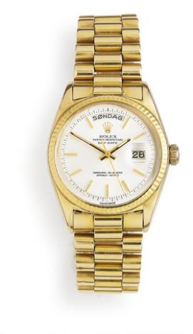 Rolex: A gentleman's wristwatch of 18k gold. Model Day-Date, ref. 18038. Chronometer certified automatic movement with day and date. 1987.