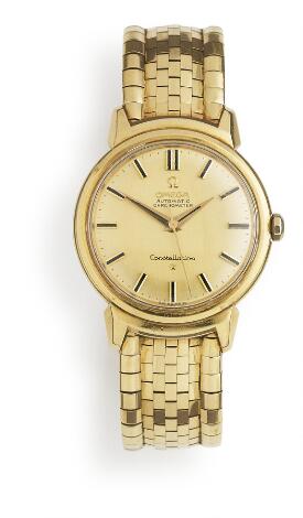 Omega: A gentleman's wristwatch of 18k gold. Model Constellation "Grand Luxe", ref. 14399 SC. Chronometer certified automatic movement. Circa 1961.