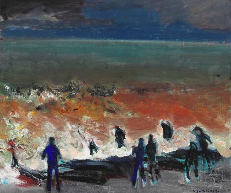 Samuel Joensen-Mikines: Whale Killing Scene, the Faroe Islands. Signed S. J. Mikines. Oil on canvas. 86 x 101 cm.