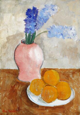 Olaf Rude: Still Life with Blue Hyacinths and Oranges. Signed Olaf Rude. Oil on canvas. 68 x 47 cm.