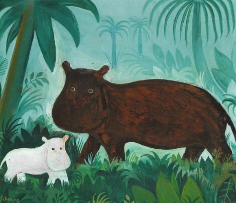 Hans Scherfig: Hippopotamus with Calf. Signed Scherfig. Tempera on masonite. 22 x 24 cm.