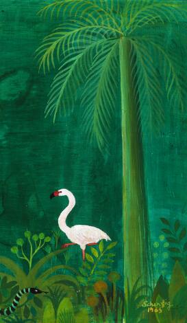 Hans Scherfig: Flamingo and Snake. Signed Hans Scherfig 1965. Oil on masonite. 36 x 23 cm.