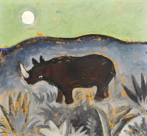 Hans Scherfig: Rhinoceros in Moonlight, c. 1937-38. Signed Scherfig. Tempera on masonite. 31 x 34 cm.