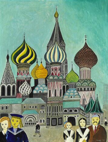 Hans Scherfig: "Vasilijkatedralen på Den Røde Plads, Moskva". Signed Scherfig 1950. Tempera on masonite. 78 x 61 cm.