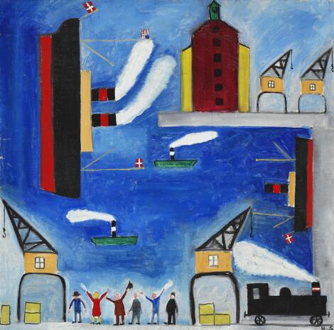 Hans Scherfig: "Københavns Havn. Amerikadamperens ankomst", 1928. Signed H.S; signed on the reverse Scherfig 1928. Oil on canvas.