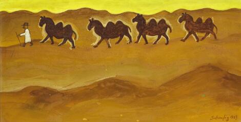 Hans Scherfig: Desert Scene with Camels. Signed Scherfig 1963. Tempera on masonite. 14 x 27 cm.