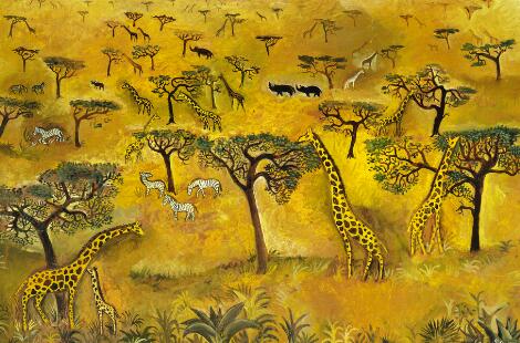 Hans Scherfig: Savannah Painting with Giraffes, Zebras and Rhinos. Signed Scherfig. Tempera on masonite. 81 x 122 cm.