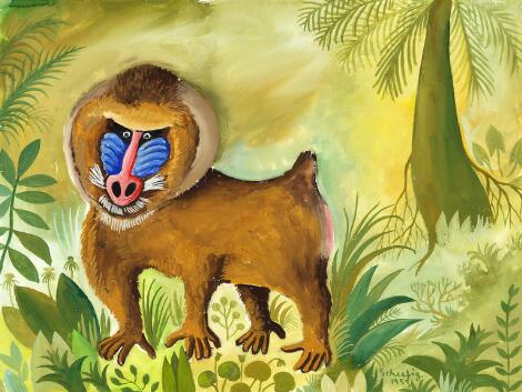 Hans Scherfig: Mandril in the Jungle. Signed Scherfig 1953. Gouache on paper. Sheet size 22 x 30 cm.