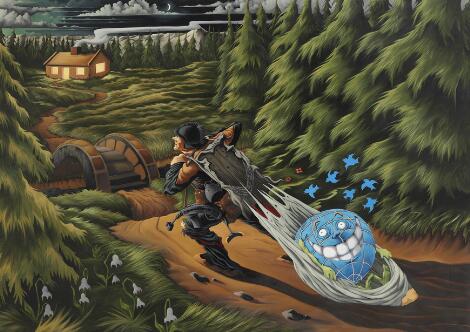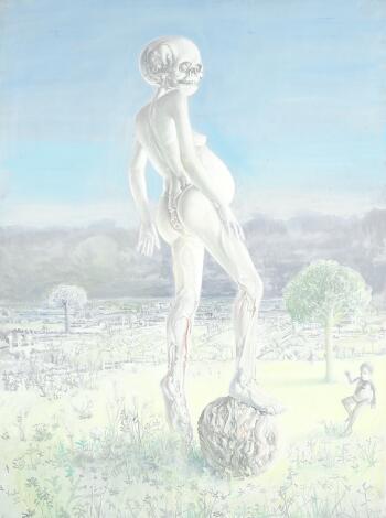 Michael Kvium: "Nature Piece III", 2005. Sign., dateret samt med titel på bagsiden. Olie på to lærreder. Samlet 160 x 330. Uindrammet.