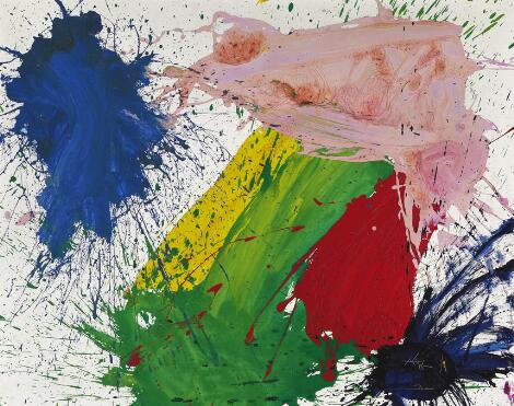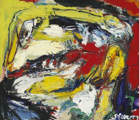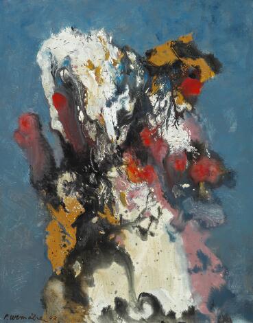 Walasse Ting: "Rose Thunder", 1963. Sign., med titel og dato på bagsiden. Olie på lærred. 65 x 81.