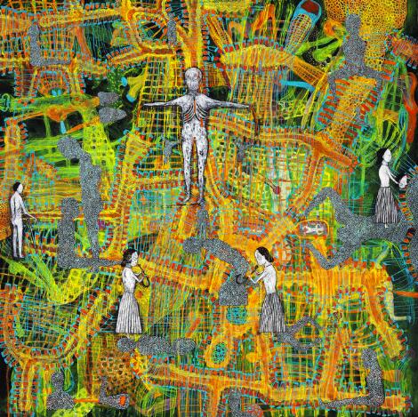 Kjell Erik Killi Olsen: "I skyggen af Jesus", 1998-99. Sign. Kjell Erik Killi Olsen på bagsiden med titel og årstal. Olie på lærred. 100 x 100.
