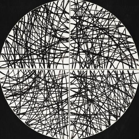 Gary Kuehn: Uden titel. Usign. Olie på lærred i fire dele. Diam. 122. Uindrammet.