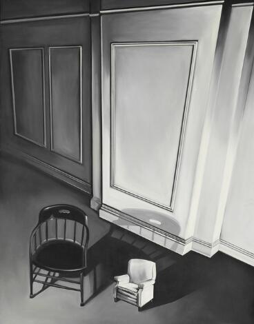 Lowell Nesbitt: "Chairs from two rooms", 1968. Sign., betitlet og dateret på bagsiden. Olie på lærred. 116 x 91.