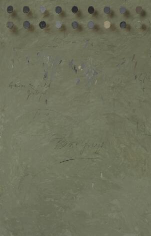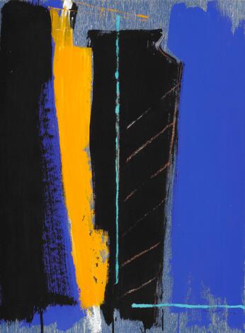 Kjell Nupen: "Meridian III", 1999/2000. Sign. Kjell Nupen; sign., dateret samt med titel på bagsiden. Mixed media på lærred. 77 x 58.