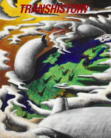 Martin Bigum: "Transhistory", 1990. Sign. på bagsiden Martin Bigum juni 90. Akryl og vinylbogstaver på lærred. 180 x 145. Uindrammet.